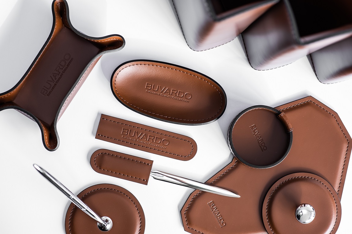 16.5*8*1.5 см. Двухслойный, из натуральной кожи, с металлической основой. Тиснение логотипа на заказ.